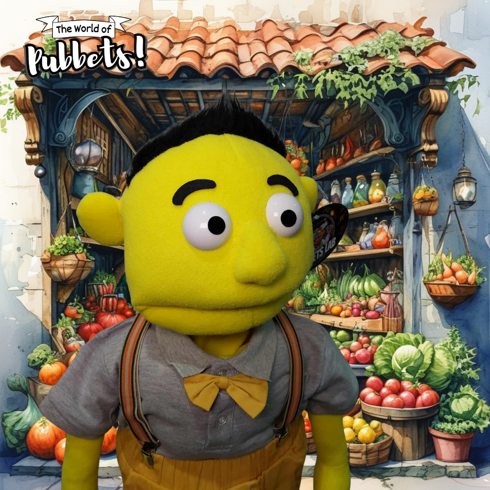 Designed and hand-built by James Marshall, founder of Pubbets, Aldo is a one-of-a-kind collector puppet. He’s bright, friendly, and reads beautifully on camera. Outfit includes a grey polo, mustard bow tie, suspenders, cuffed shorts, and sneakers.