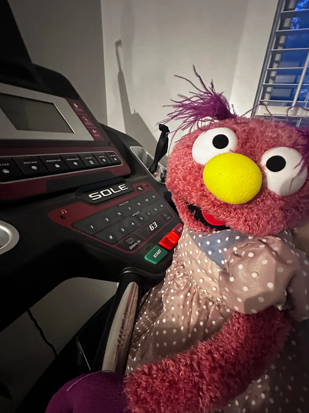- Color: Mauve with purple faux ostrich feather hair, yellow nose, and purple hands and feet.